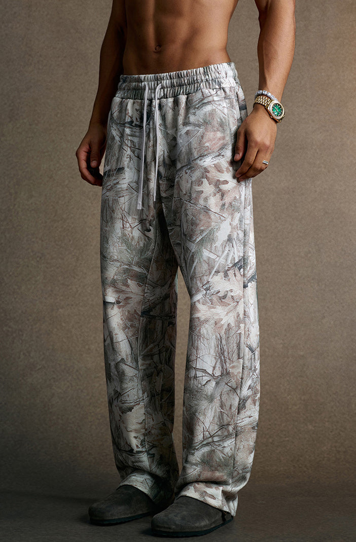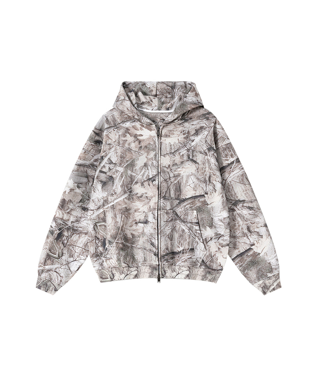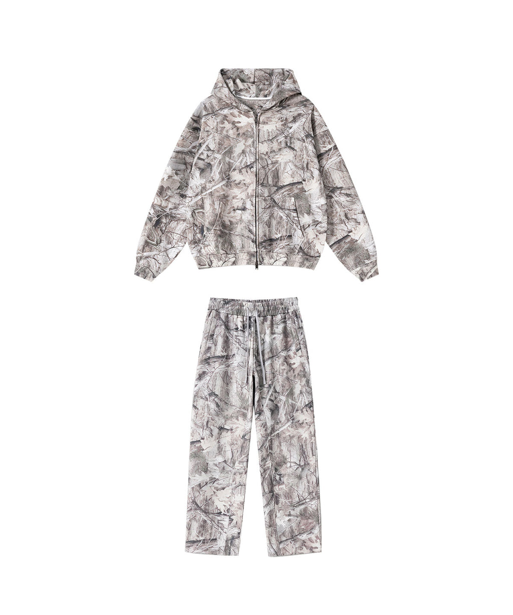 This is a camouflage - patterned zip - up hoodie and casual sweatpants set.