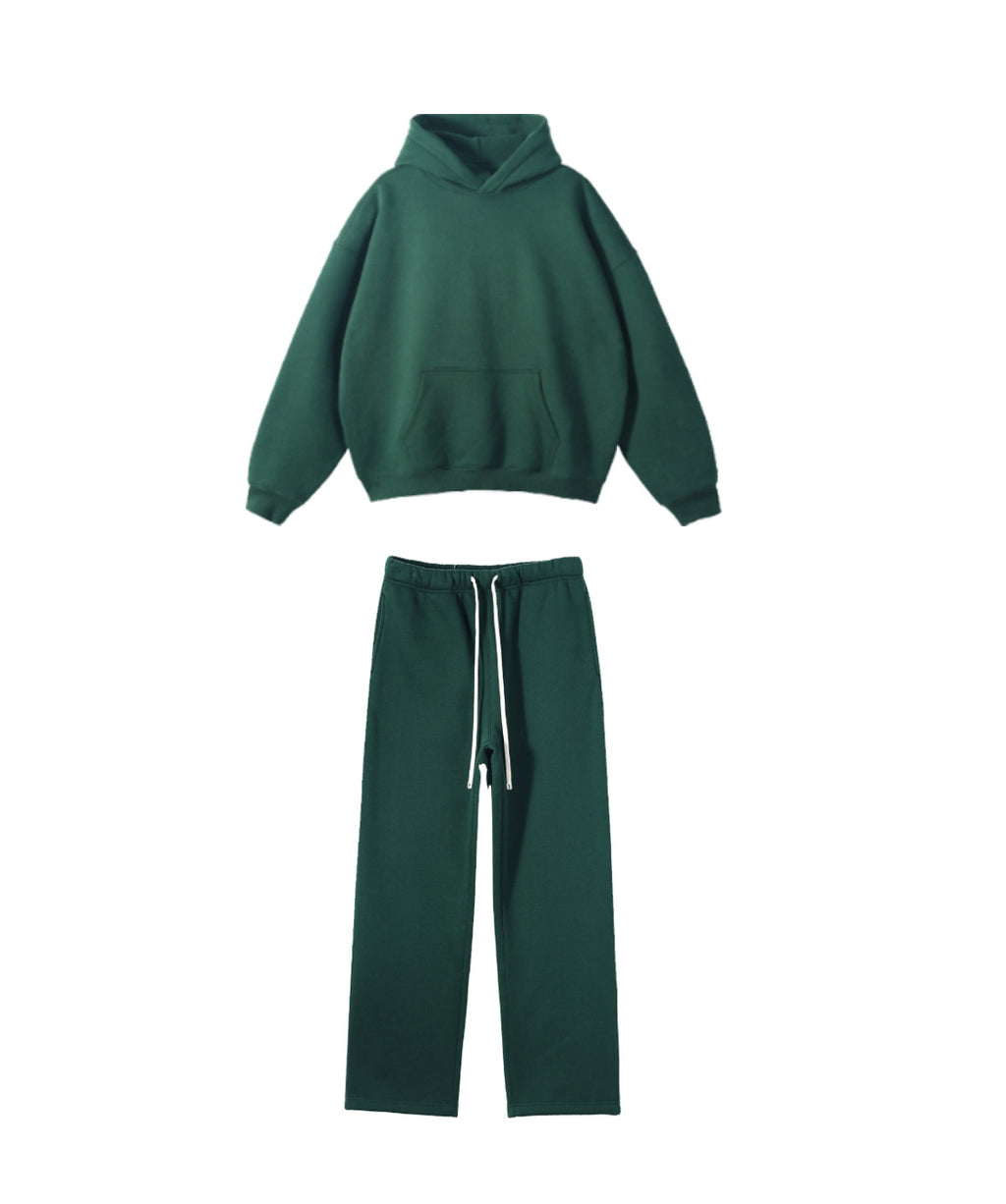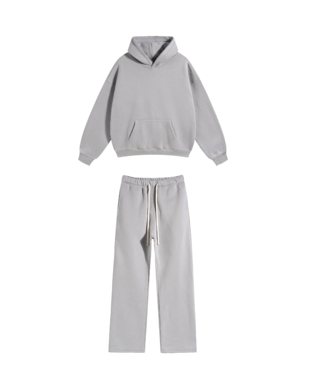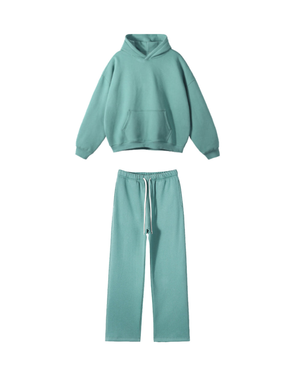 Basic hooded sweatshirt and sweatpants set. Solid color design throughout.