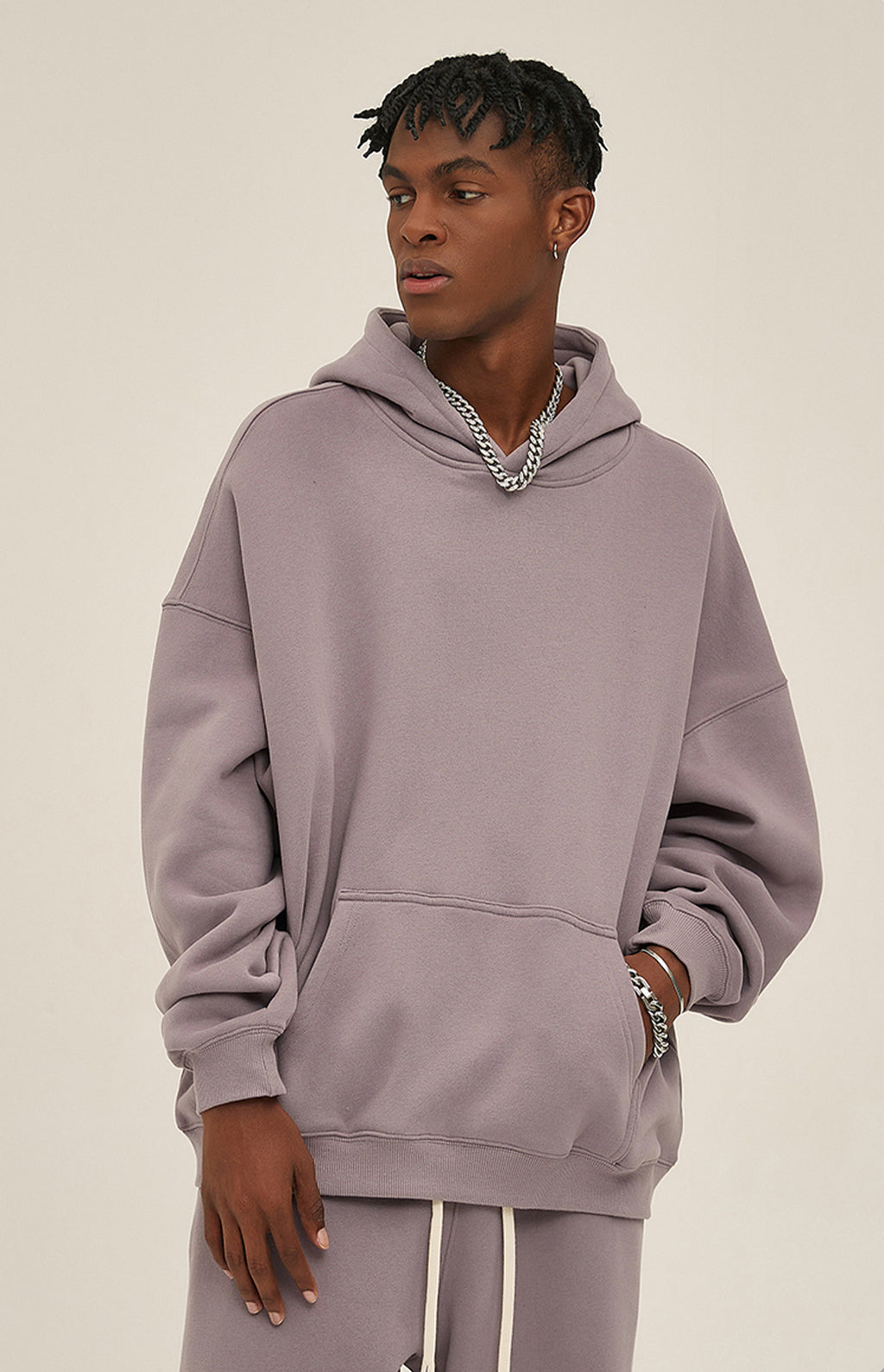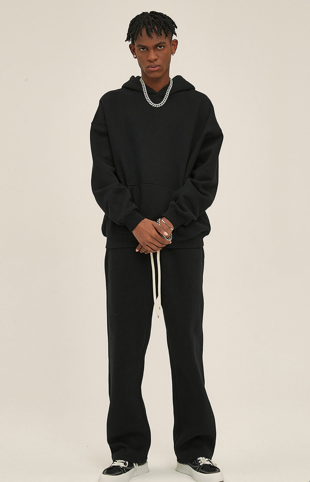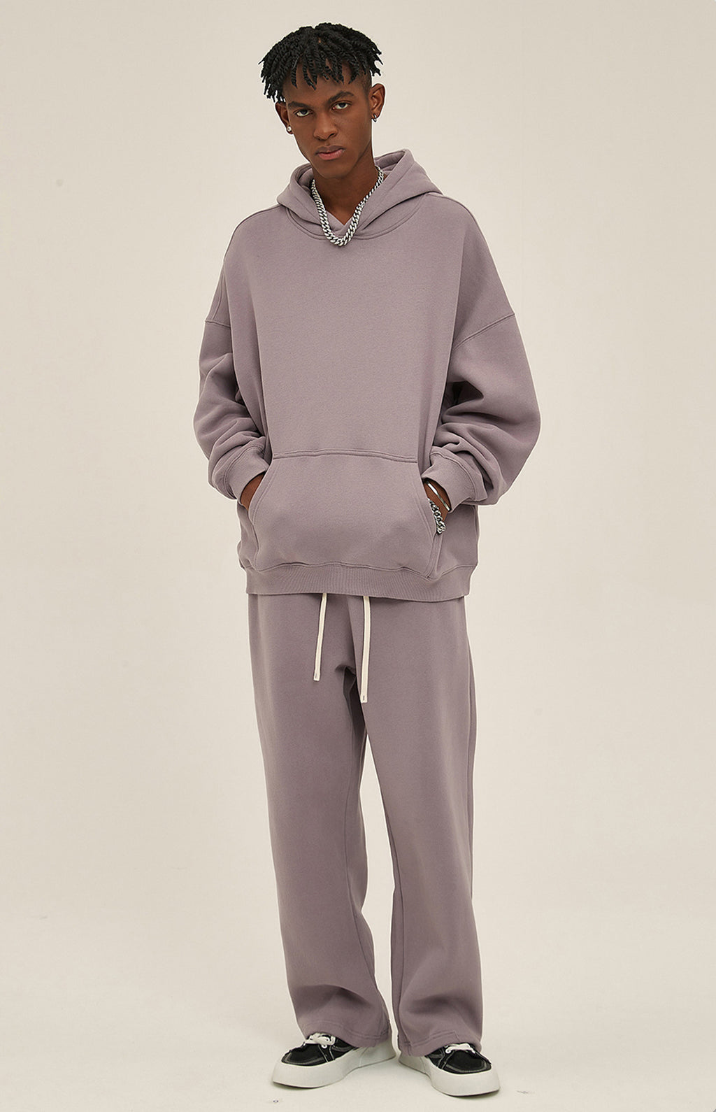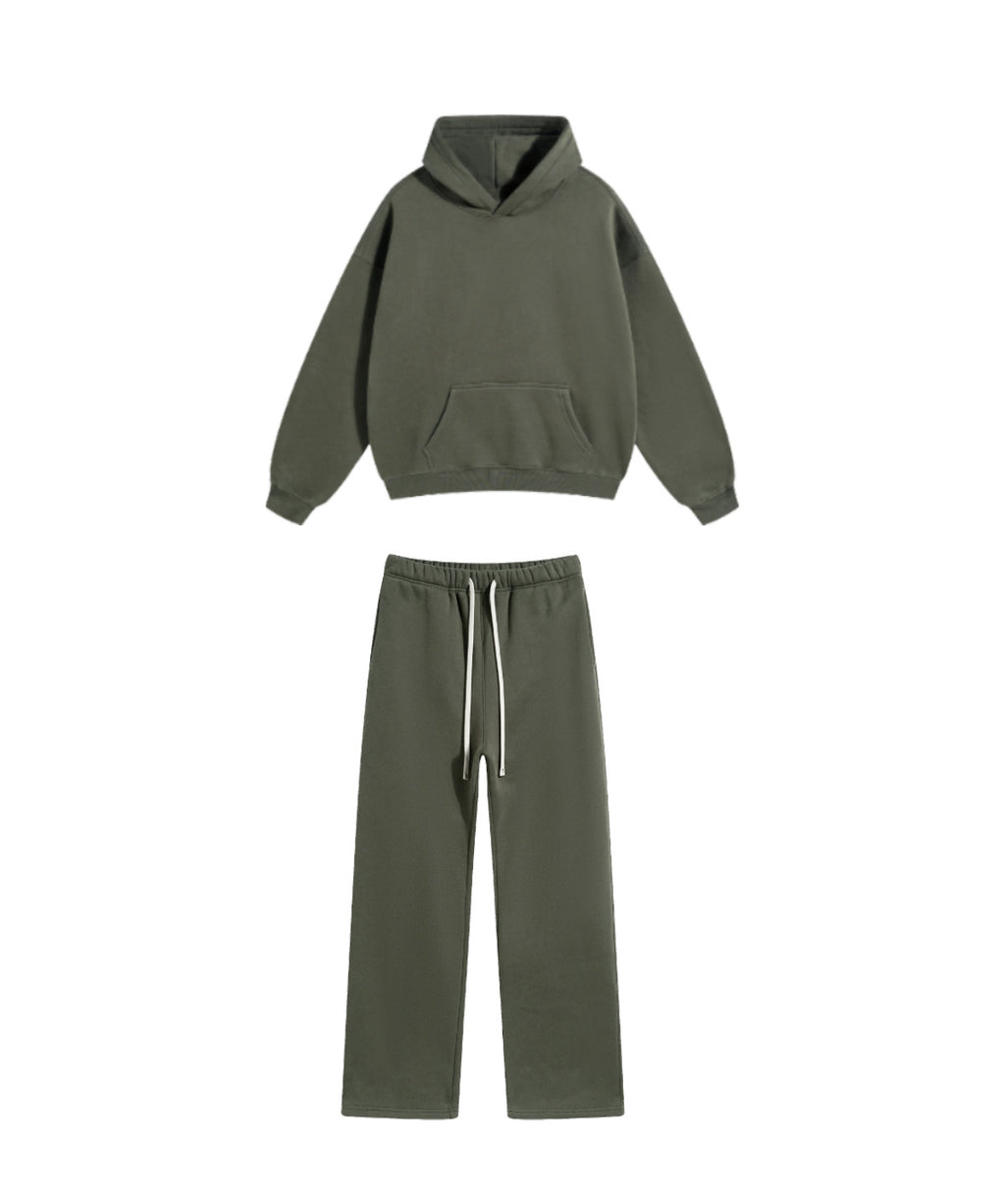 Basic hooded sweatshirt and sweatpants set. Solid color design throughout.